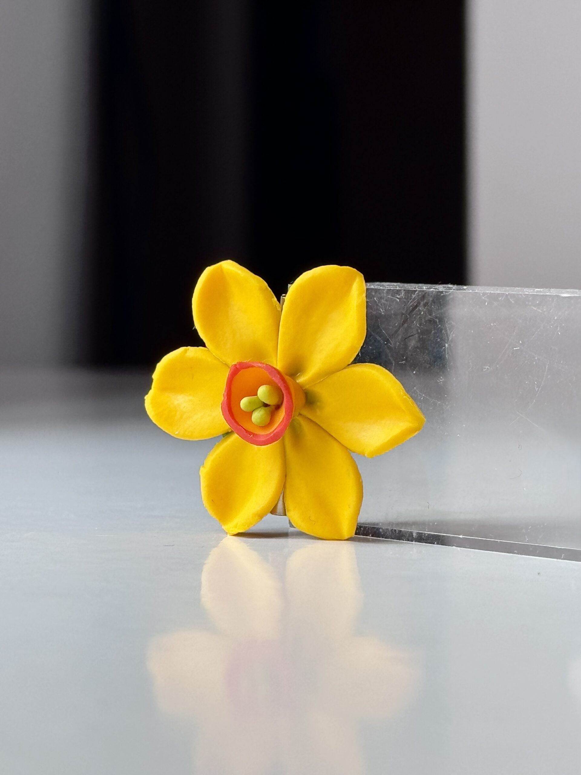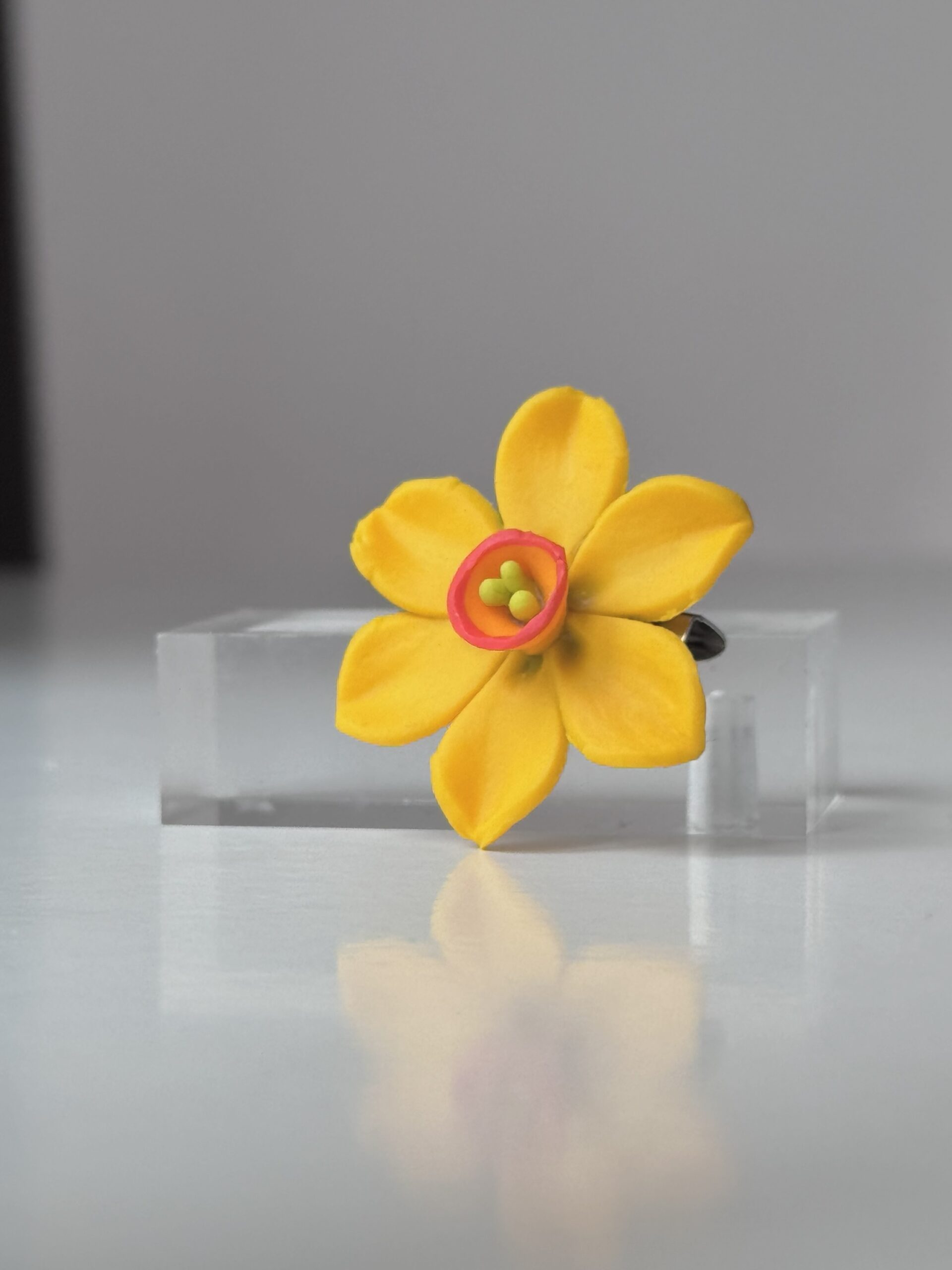 Broșa cu Narcisă galbenă surprinde frumusețea simplă a unei flori de primăvară, în cea mai pură formă a ei. Petalele galbene ,luminoase, dau senzația de prospețime și liniște, ca o dimineață senină în care natura renaște în tăcere.O piesă delicată, ușoară, care adaugă un accent luminos și elegant oricărei ținute. Un simbol al luminii speranței și bucuriei de a purta primăvara aproape de inima